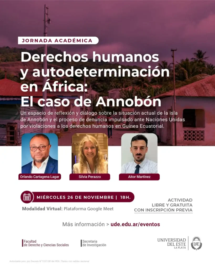 La actividad —abierta y gratuita, con inscripción previa— se llevará a cabo el miércoles 26 de noviembre a las 18:00 hora argentina (22:00 hora española) a través de Google Meet. Se puede acceder al formulario de inscripción vía https://www.ude.edu.ar/eventos/jornada-academica-sobre-derechos-humanos-y-autodeterminacion-en-africa-el-caso-de-annobon/.