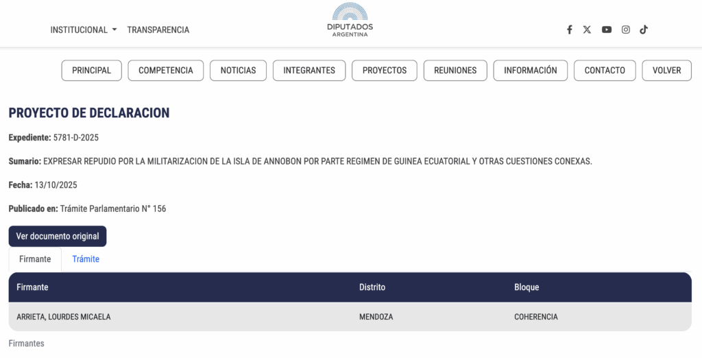 }La diputada nacional Lourdes Arrieta presentó en el Congreso de la Nación Argentina el proyecto de declaración 5781-D-2025, por el cual la Cámara de Diputados expresa su “más enérgico repudio a la militarización de la isla de Annobón por parte del régimen de Guinea Ecuatorial” y manifiesta su “profunda preocupación por las denuncias públicas provenientes de la prensa internacional, organizaciones de derechos humanos y ciudadanos annoboneses en el exilio”.
